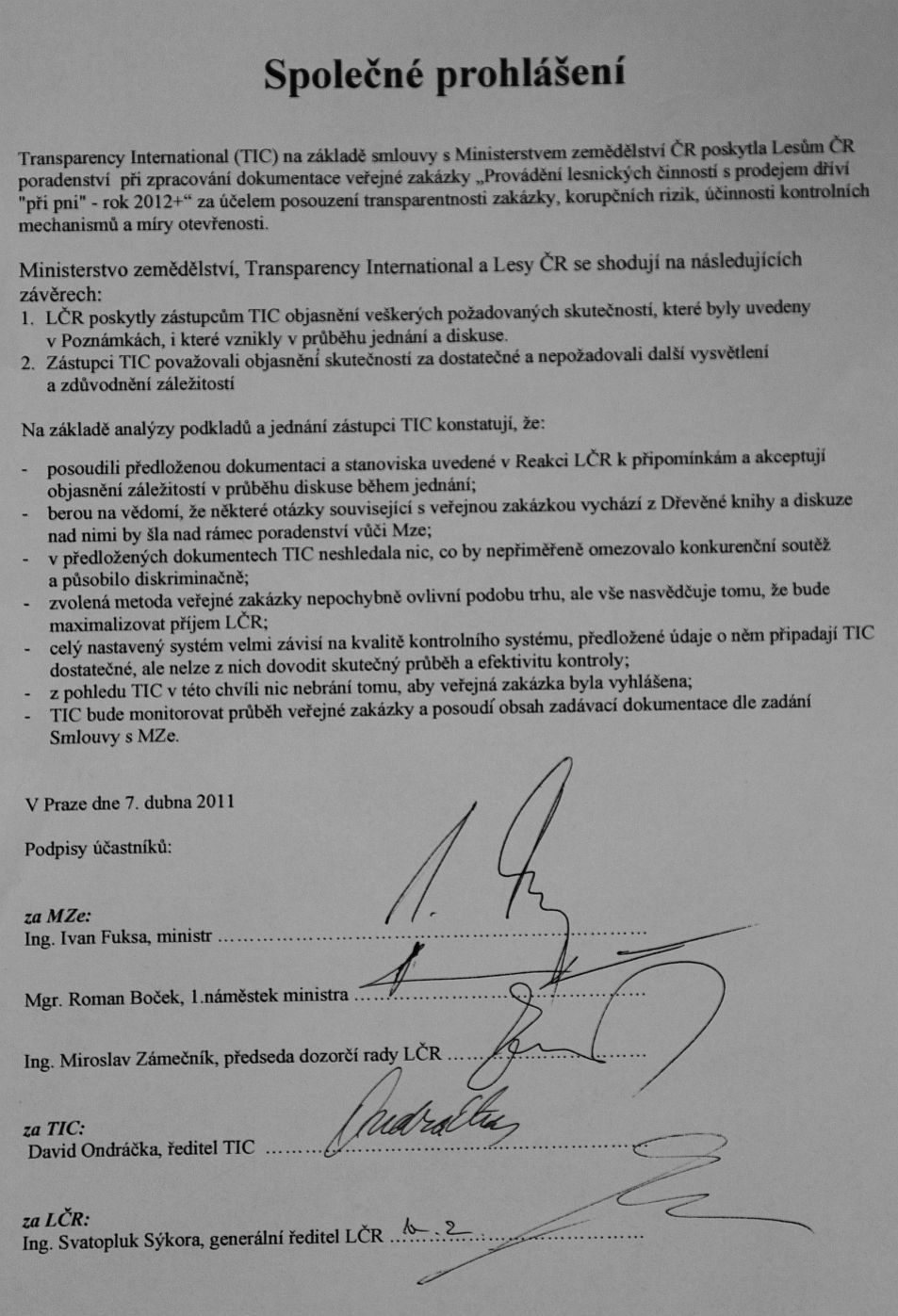 Ministr na briefingu zrekapituloval přípravu a projednávání Dřevěné knihy, která nastínila základní parametry tendru Lesů ČR. Poděkoval za spolupráci s Transparency international (TIC), která je shrnuta ve společném prohlášení, z něhož ministr vyzdvihl: