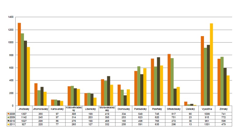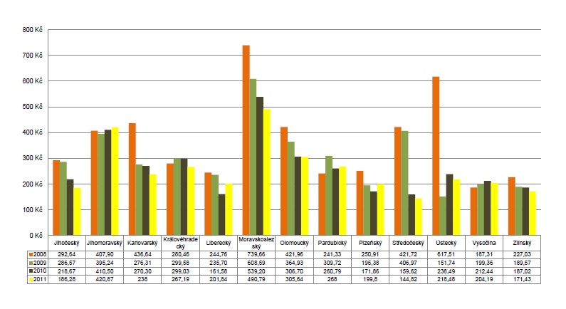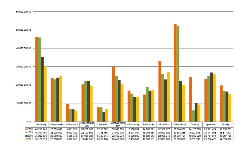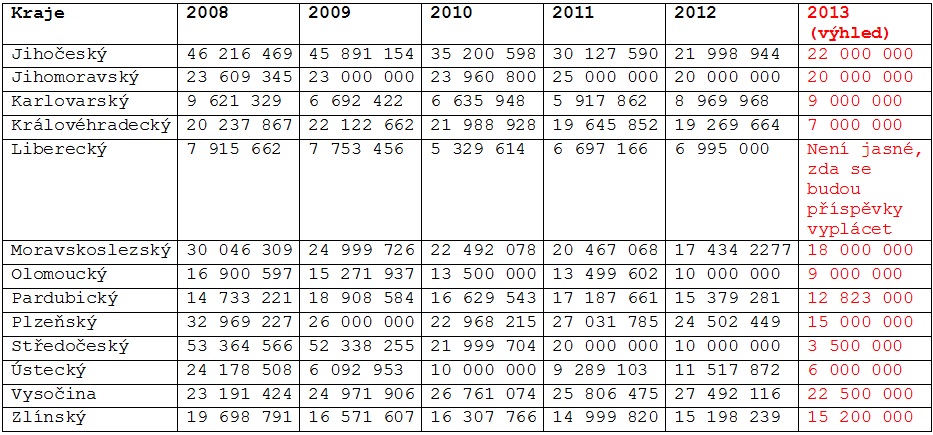 Vývoj finančních prostředků vyplacených jednotlivými kraji v letech 2008–2012 s výhledem na rok 2013 ukazuje tabulka.