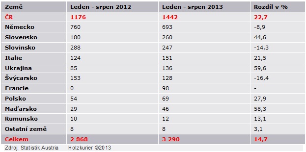 Dovoz jehličnatého dříví z České republiky vzrostl v prvních třech kvartálech 2012 téměř o čtvrtinu na 1,45 milionu m3. Z Německa bylo dodáno 693 000 m3, což je o 67 000 m3 méně než vloni. Novým dodavatelem pro Rakousko se stala Francie, která dodala v roce 2013 celkem 98 000 m3 dříví.