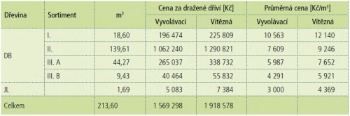 V proběhlé dražbě převažovala dřevina dub v kvalitách I., II., III. A a okrajově III. B třídy jakosti. Pro zpestření byly ještě draženy tři výřezy jilmu habrolistého v kvalitě III. A a III. B. Dražené dříví pocházelo z 90 % ze státních lesů, kde vykonáváme zakázku pro LČR, zbylé množství dříví pocházelo z námi spravovaných obecních lesů.