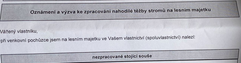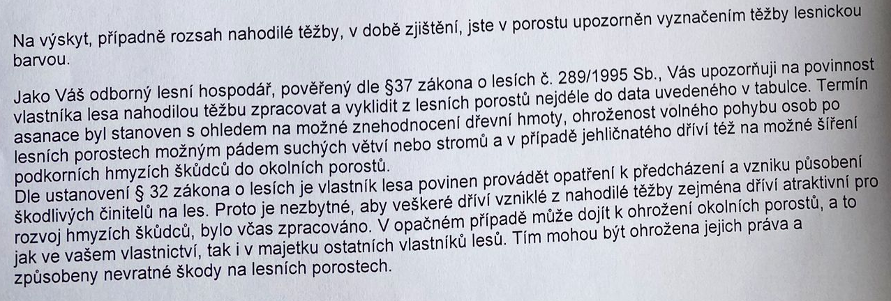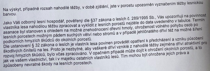 Výňatky z typizované výzvy vlastníkovi lesa od odborného lesního hospodáře LČR, s.p. Zdroj: Hnutí DUHA
