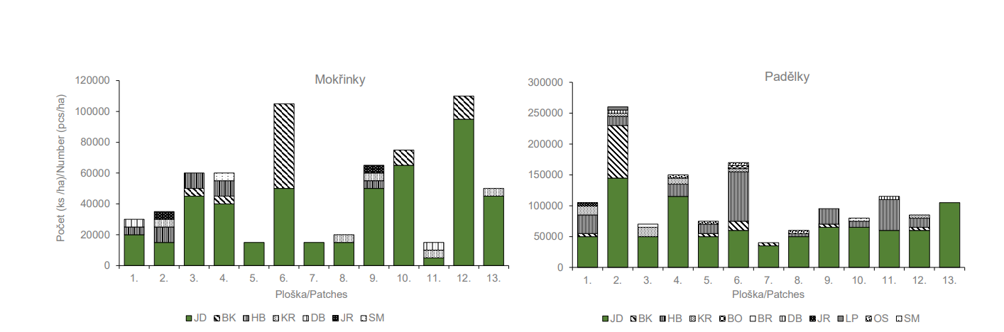 Grafy: Početnost dřevin přirozené obnovy na jednotlivých ploškách zájmových porostů. Zdroj: Zprávy lesnického výzkumu