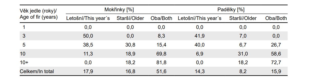 Tab.: Poškození přirozené obnovy jedle zvěří v zájmových porostech (v členění na okus tohoroční, starší, oba). Zdroj: Zprávy lesnického výzkumu