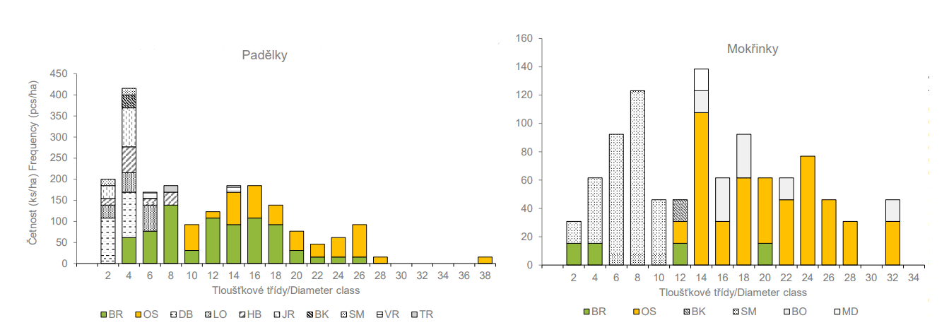 V obou porostech v přirozené obnově dominovala jedle – 73 % (Mokřinky), resp. 65 % (Padělky). Obnova jedle byla na obou plochách zastoupena v širokém rozpětí věku od stáří jednoho roku do více než deseti let. Poškození jedle zvěří bylo značné na obou plochách – 14 % (Padělky), resp. 18 % (Mokřinky).