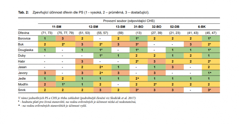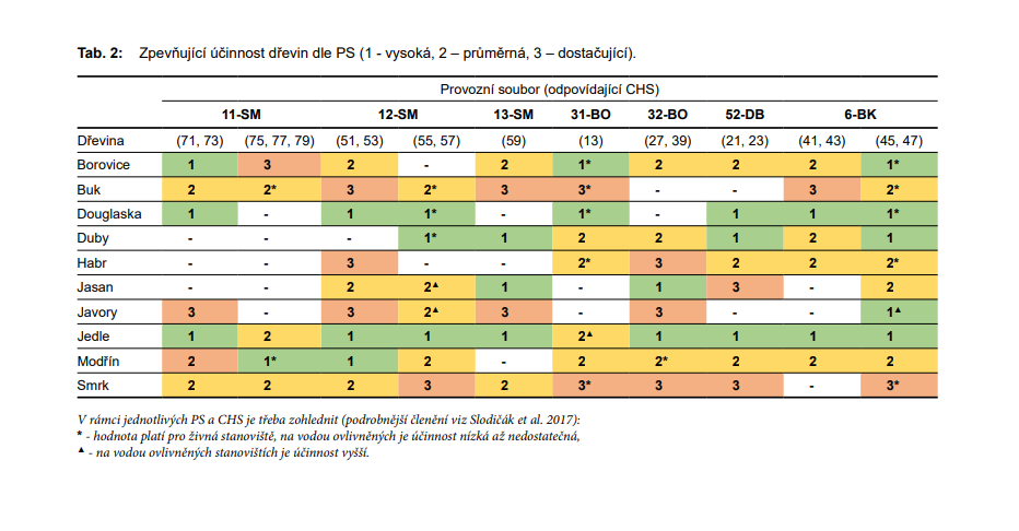Zpevňující účinnost dřevin dle provozních souborů. Pozn.: 11-SM – Cílové SM (přirozené) hospodářství horských poloh, 12-SM – Cílové BK-SM (JD a smíšené) hospodářství vyšších poloh, 13-SM – Cílové SM (JD, BO) hospodářství na glejových a rašelinných stanovištích, 31-BO – Cílové BO hospodářství na přirozených borových stanovištích, 32-BO – Cílové BO (SM, DB, JD) hospodářství na chudých zamokřených stanovištích, 52-DB – Cílové DB (BO, smíšené) hospodářství nižších poloh, 6-BK – Cílové BK (SM, BO, DB a smíšené)