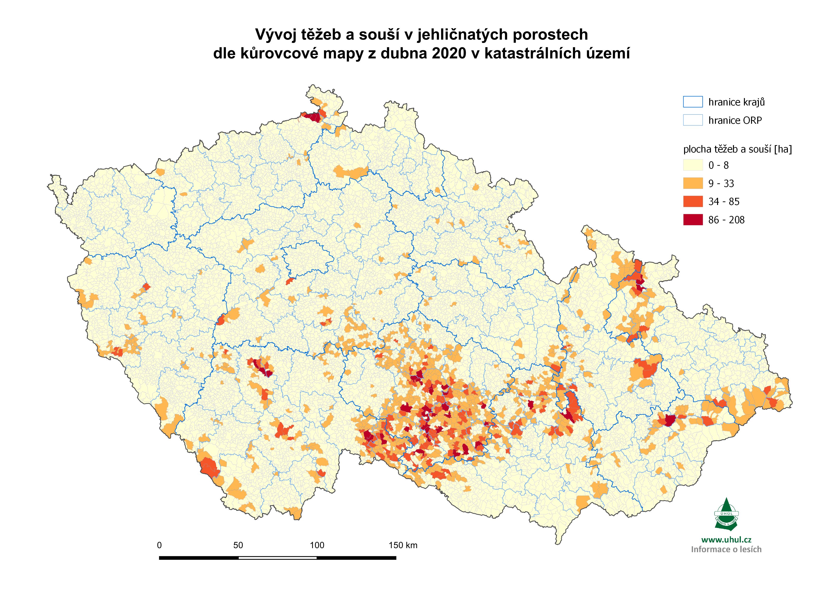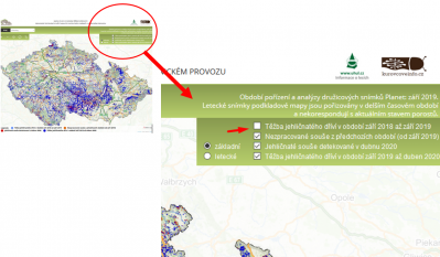 - Jehličnaté souše detekované v dubnu 2020 (červeně)