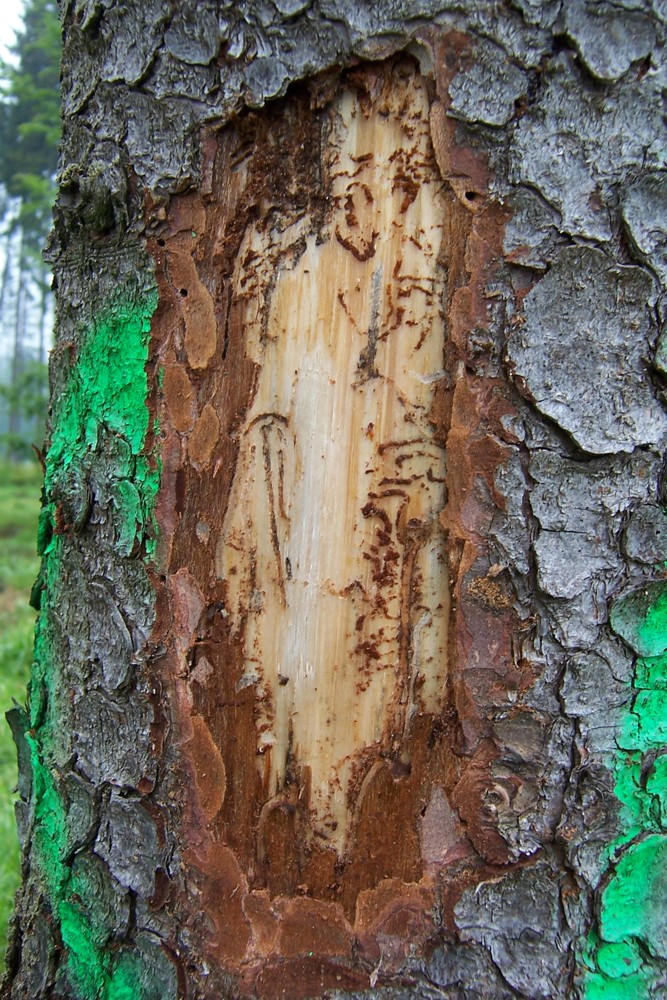Navíc při posledním náletu na přelomu srpna a září se lýkožrout smrkový začal „chovat podle učebnic ochrany lesa" a napadal často pouze podkorunovou část kmene. Není proto bez předchozích projevů tohoto znaku prakticky dohledatelný. S ohledem na úsporu času lze proto doporučit ve směru šíření ohniska vedle již ptáky nalezených stromů pomocí pokácení vzorníků ověřit, zda sousední stromy nejsou napadeny rovněž a podle toho postupovat dále.