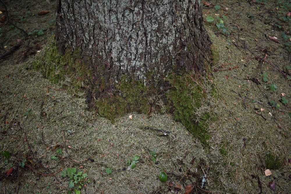 Opadané jehličí u paty stromu.