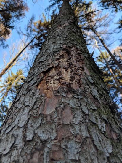 Loupající se kůra stromu napadeného lýkožroutem smrkovým.