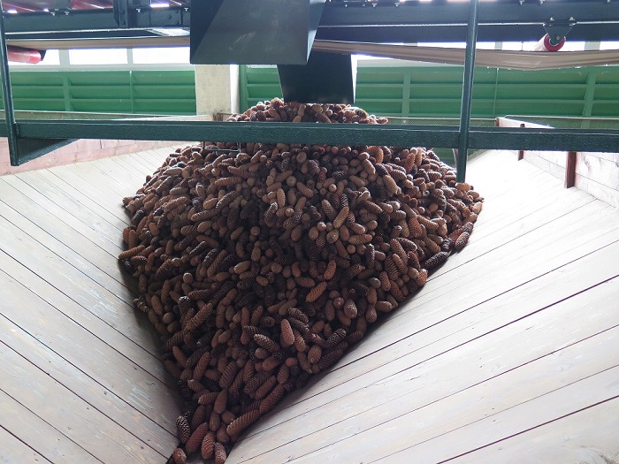 Dovezená surovina je skladována ve čtyřpatrovém skladu surovin v jednotlivých boxech dle původu. Ve skladu šišky před luštěním prosychají na vlhkost do 20 %.