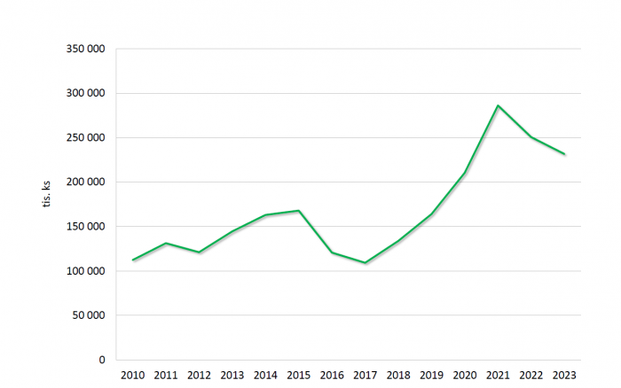 Objem sadebního materiálu lesních dřevin uvedený do oběhu v letech 2010-2023. Zdroj: SLŠ ČR