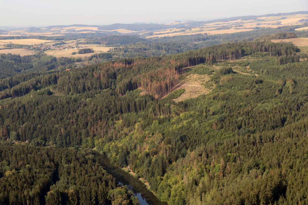 Letecký pohled ukazuje obrovský rozsah kalamity na významné části území ČR. Četnost skládek a techniky v lesích jasně dokumentuje reálný nedostatek kapacit pro zvládnutí takto rozsáhlé kalamity.
