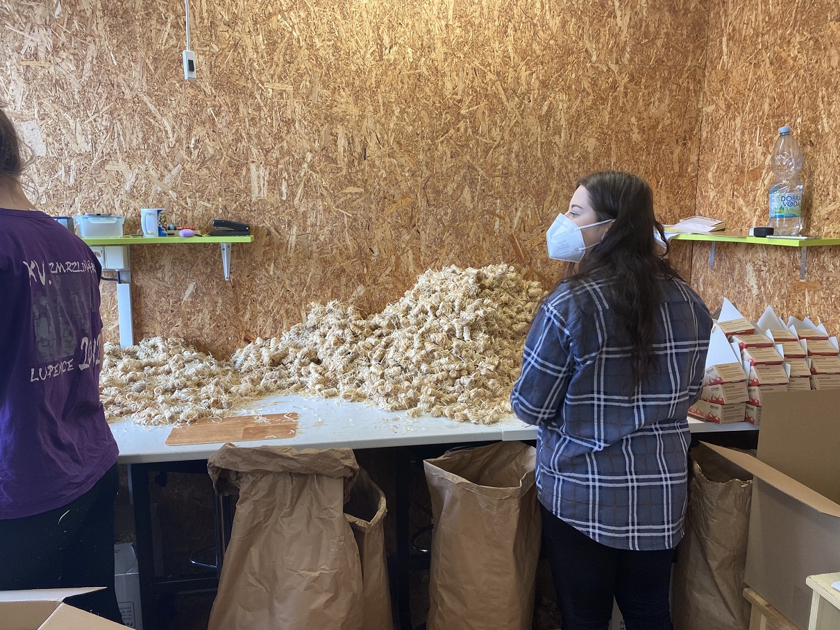 Hotové dřevité provazce jsou prodávány jako konečný produkt – například jako výplň mezi trámy roubenek, ale většina je využívána k výrobě přírodního podpalovače. Jeho vlastní výroba je know-how firmy. „Způsob, jakým se provazce namáčí, i druh parafínu jsou naším obchodním tajemstvím, otce stálo spoustu zkoušení, než našel způsob zaručující požadovanou kvalitu výrobku,“ vysvětluje v hale na výrobu podpalovačů Marek Švec. Parafínem napuštěné provazce se následně na průmyslové krátičce nakrátí na různé délky dle požadavků zákazníka a míří do balírny. Ta je naopak doménou žen, které provádí kontrolu kvality podpalovače, tak aby měly jednotnou délku a tloušťku, a balí je ke konečným odběratelům. Než se tedy takový podpalovač dostane ke konečnému zákazníkovi, projde mnoha rukama, celá výroba je charakteristická velkým podílem ruční práce.![]()