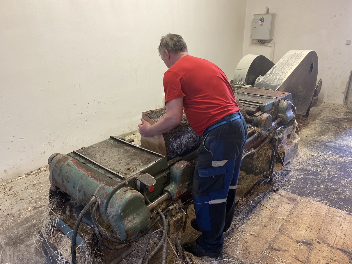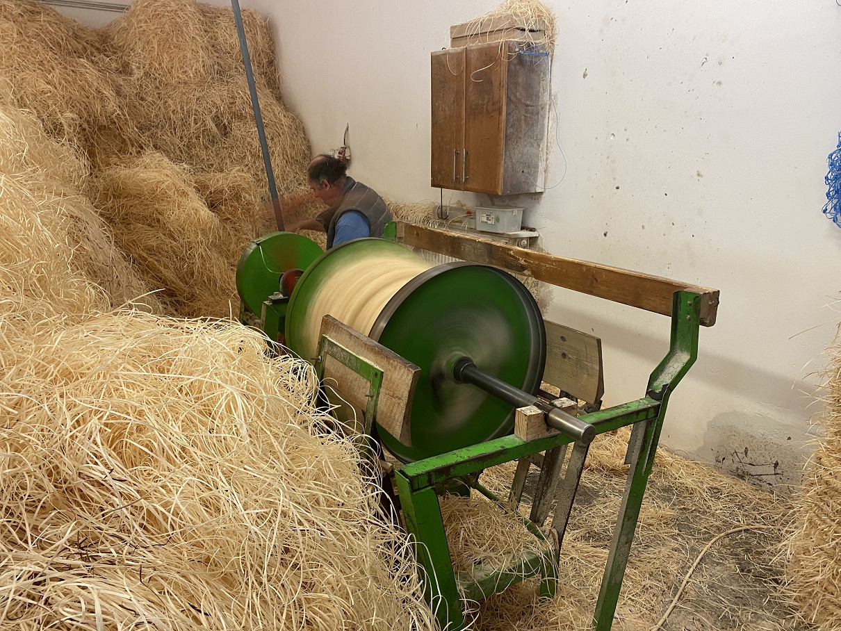 Dřevitá vlna je uložena v hale, kde se z ní na speciálních motacích strojích stáčí dřevěné provazce, nebo se rovnou balí jako konečný produkt k zákazníkovi. Na stáčení provazců se používá hrubá dřevitá vlna. Je to fyzicky náročná práce, proto ji vykonávají pouze muži. „Zapracování na stáčecích strojích trvá kolem tří měsíců, máme k dispozici jeden stroj – trenažér, na kterém si chlapi zaplétání dřevěné vlny ze začátku zkouší, je to o velké manuální zručnosti,“ vysvětluje Marek Švec. I to je jeden z důvodů, proč se snaží zaměstnance udržet a sází na místní zaměstnance. „Mohli bychom samozřejmě zaměstnat za menší peníze i lidi z ciziny, ale ti pak odjedou a museli bychom zaučovat nové. Máme tu i zaměstnance, kteří jsou s firmou téměř po celou dobu jejího fungování.“![]()