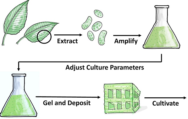 Proces začíná extrakcí buněk z rostliny ostálky a jejich vložením do kapalné kultury. Pro zahájení růstu se buněčná suspenze smísí se speciálním gelovým médiem. Do gelu se vpraví rostlinné hormony způsobující tvorbu ligninu. Vědci sledovali vliv počáteční hustoty buněk, koncentraci rostlinných hormonů a pH na celý proces. Tvar kultivovaných materiálů byl řízen odléváním nebo biotiskem (3D kultury).![]()