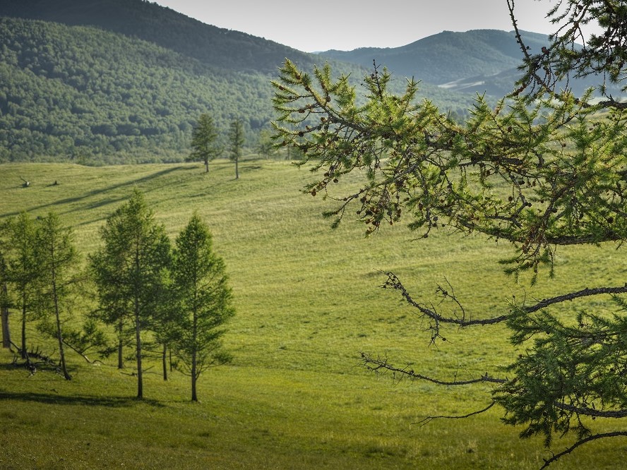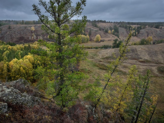 Obr. 2: Lesostepní krajina s modřínem (Larix sibirica) v podhůří pohoří Altaj. Foto: P. Pokorný