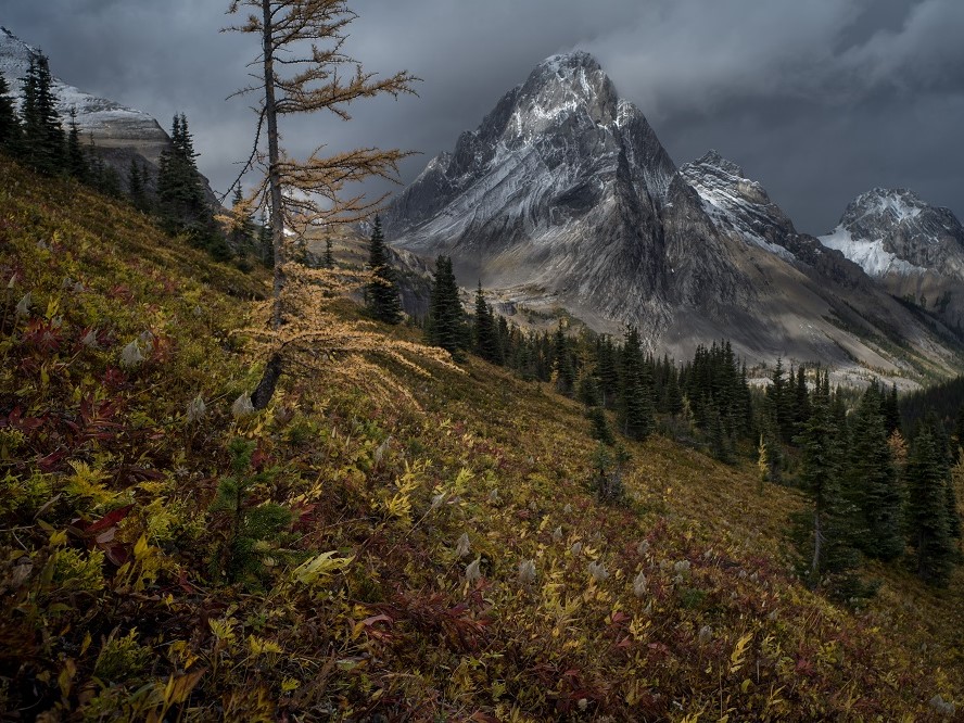 Obr. 3: Horní hranice lesa ve Skalistých horách (v JZ Kanadě) s jednotlivě rostoucími modříny Larix occidentalis. Foto: P. Pokorný