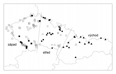 Obr. 7: Přehled stávajících palynologických dokladů modřínu na území České republiky a Slovenska. Mapa zdokumentovaných lokalit s nálezy (plné symboly) a bez nálezů (prázdné symboly) pylových zrn, bez ohledu na stáří těchto nálezů. Území je víceméně arbitrárně rozděleno na východní, střední a západní pás. Od západu na východ nálezů očividně přibývá.