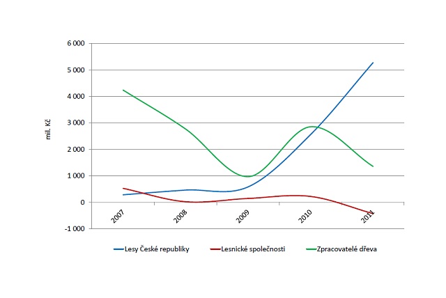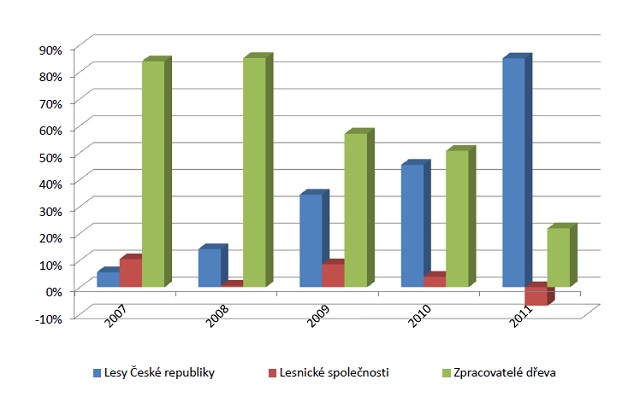 Zatímco Lesy ČR zvýšily v roce 2011 svůj přepočítaný výsledek hospodaření o 67 % na historicky rekordních 4 058 Kč/ha, podnikatelské subjekty (lesnické společnosti) snížily v roce 2011 svůj HV o 131 % a propadly se do ztráty -168 Kč/ha (zdroj: rezortní statistika Les (MZe) 1-02); přitom průměr HV lesnických firem za období 2003–2010 činí 235 Kč/ha.