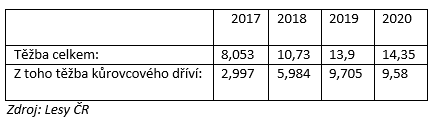 Těžba dříví ve státních lesích začala významně růst s příchodem kůrovcové kalamity od roku 2018. V letech bez kůrovcové kalamity byla těžba u Lesů ČR kolem osmi milionů metrů krychlových.