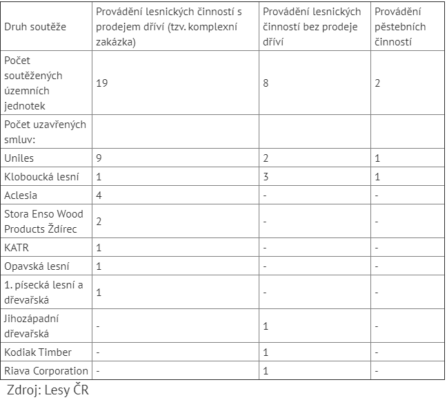 Vedle Unilesu a Kloboucké lesní si zbývajících osm podepsaných jednotek rozdělilo sedm firem. Na čtyřech dosud nepodepsaných jednotkách dala nejlepší nabídku společnost Aclesia. Loňský vítěz tendru 2020+, těžařská skupina Petra z Hodonína, letos nemá na žádné jednotce nejlepší nabídku. Loni podepsala kontrakty na deseti z 54 soutěžených jednotek.