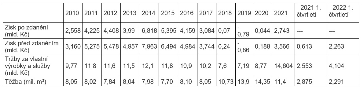 Tržby podniku tažené růstem cen dřeva v prvním čtvrtletí výrazně stouply i přesto, že těžba dřeva s ústupem kůrovcové kalamity meziročně klesla o 20 procent na 2,29 milionu metrů krychlových. Za celý rok 2021 těžba dřeva ve státních lesích klesla také o pětinu na 11,4 milionu metrů krychlových. Letos bude zřejmě následovat další pokles na asi deset milionů metrů krychlových dřeva. Z nich asi 30 procent připadne na kůrovcové dřevo.