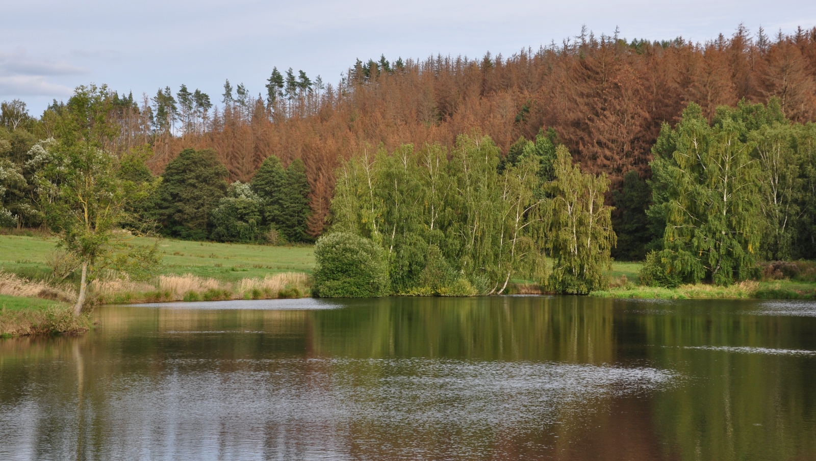 Rybník mezi uschlými smrky. Foto: Jan Řezáč