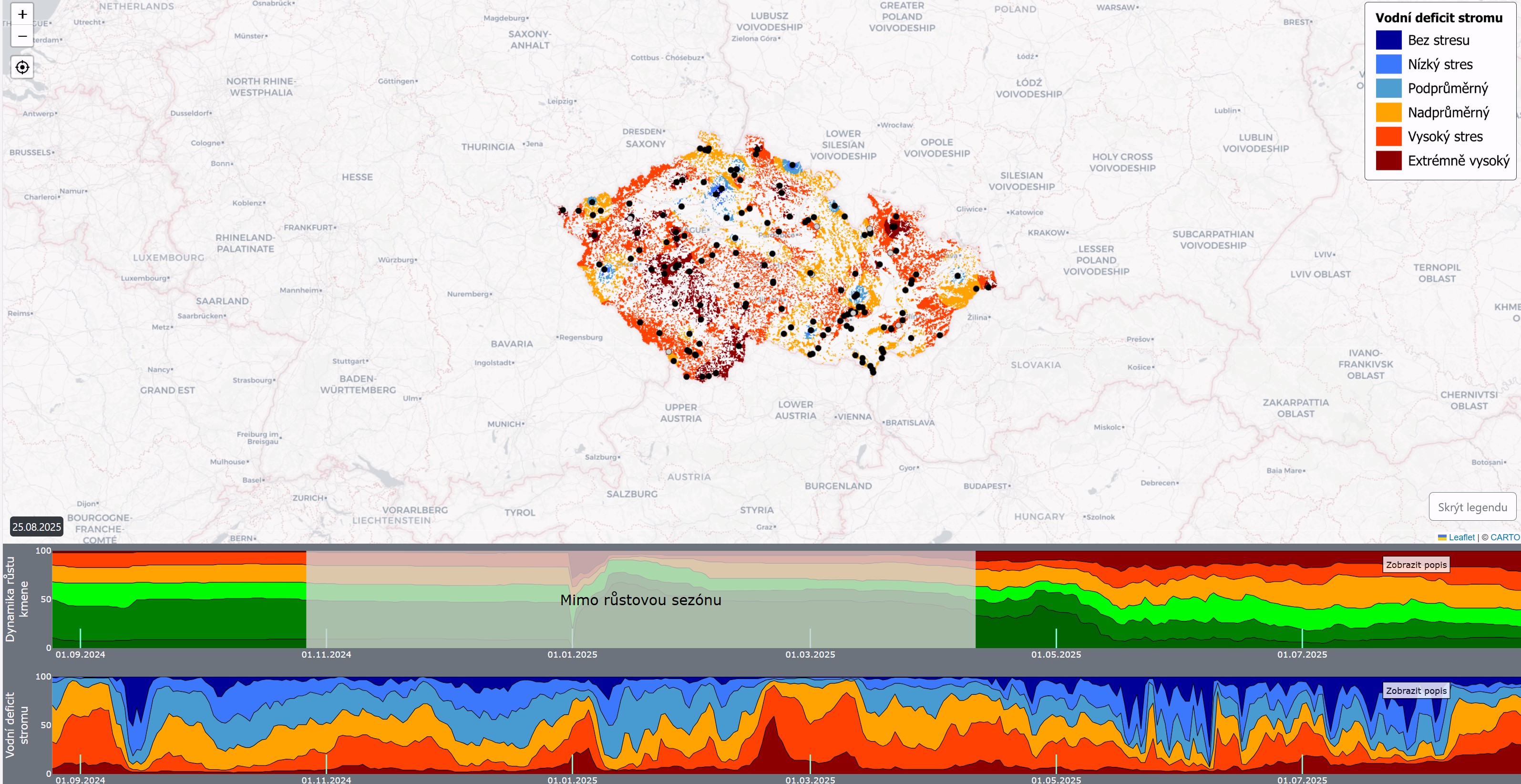 Ve srovnání s dlouhodobým normálem z období let 2005 až 2024 současná produkce lesů významně klesá. „Přes 60 % území je v současnosti v kategorii podprůměrné produkce a 20 % území je dokonce v nejhorší kategorii s extrémně nízkým přírůstem,“ popsal situaci Jan Krejza. Podle aktuální mapy dostupné na webu DendroNetwork je nejhorší situace v Jeseníkách, Novohradských horách a na Třeboňsku a také na jih od Prahy až k podhůří Šumavy. Aktuální vitalitu stromů a jejich chování mohou vědci sledovat díky síti stanic, které jsou rozmístěné v terénu po celém Česku na různých druzích stromů a v různých typech lesa.