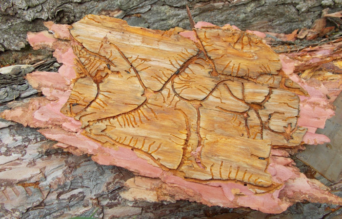 Požerek lýkožrouta modřínového v lýku na borce v pokročilé fázi vývoje s matečnými a larválními chodbami. Foto: K. Resnerová