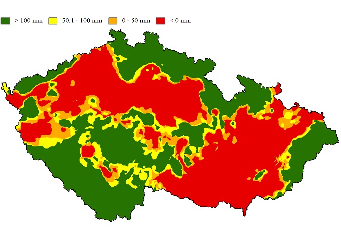 1) negativní bilance – tj. oblasti s celkovou bilancí pod 0 mm, kde byly lesní porosty výrazně stresovány suchem. Pro smrk jsou považovány za nepříznivé i následující dvě kategorie: