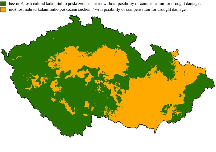 Pro účely poskytování náhrad kalamitního poškození suchem byly oblasti sloučeny do dvou kategorií: 1) bez možnosti náhrad = bez ohrožení suchem + mírné poškození suchem + oblast bez dlouhodobého působení sucha; 2) s možností náhrad kalamitního poškození suchem = oblasti ohrožené až extrémně ohrožené suchem v roce 2015 a zároveň s nepříznivou vláhovou bilancí v letech 2012–2014.