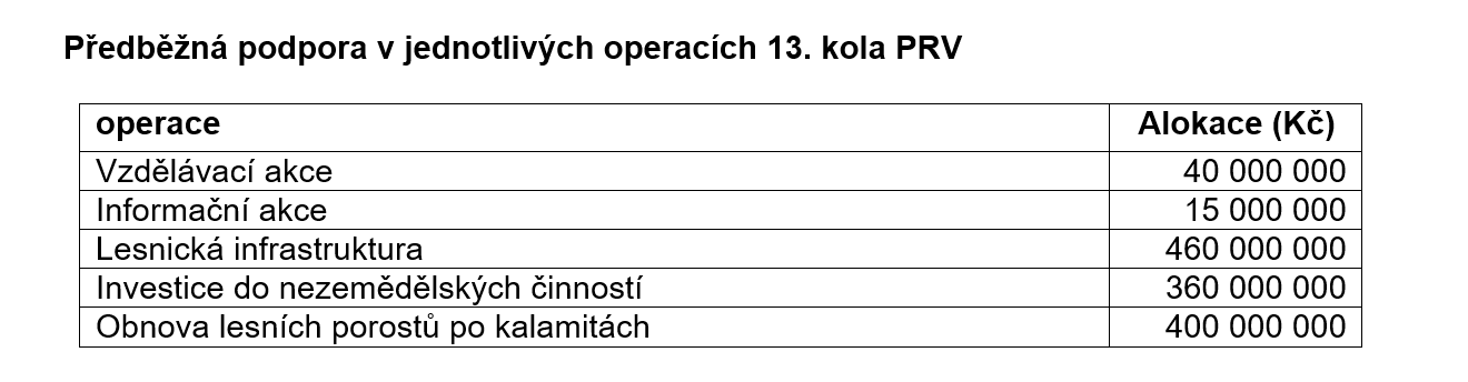 Ve 13. kole příjmu žádostí z PRV 2014–2020 podpoří Ministerstvo zemědělství (MZe) rekonstrukce a výstavbu cest v lesích. Přispěje také lesníkům na obnovu lesních porostů. Tato operace je zaměřená na zalesnění holin po kalamitách způsobených větrem nebo suchem. O příspěvek z operace Investice do nezemědělských činností mohou zase požádat zemědělci, kteří chtějí rozšířit své podnikání například o zpracování dřeva či potravinářskou a textilní výrobu. Dotace slouží posílení ekonomického potenciálu venkova.![]()