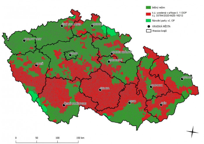 "Kůrovcová kalamita se rozšiřuje především západním směrem. K rozšíření zóny došlo prakticky ve všech krajích. Červená zóna oproti předchozímu stavu zásadně narostla ve Středočeském kraji, s ohledem na přetrvávající sucho také v Ústeckém a Libereckém kraji. Dosud nejmenší rozsah registrujeme v Karlovarském kraji," uvedl mluvčí ministerstva Vojtěch Bílý.