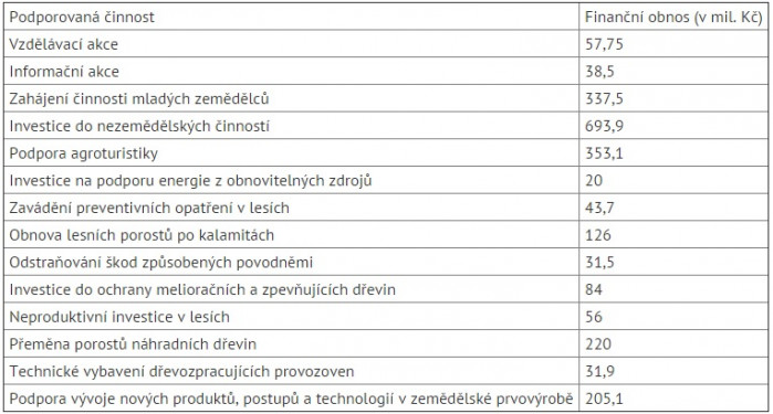 Největší část, téměř 700 milionů korun, by měla jít do podpory investičních nezemědělských aktivit.