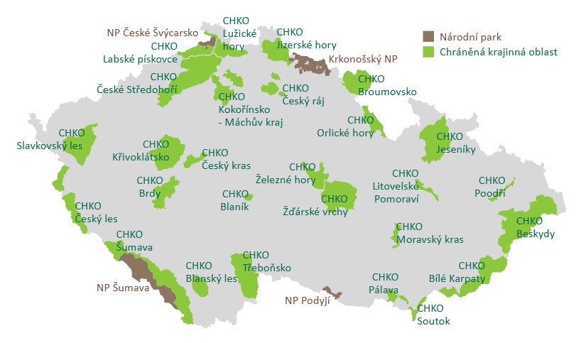 Mapa velkoplošných zvláště chráněných území v ČR. Zdroj: AOPK ČR