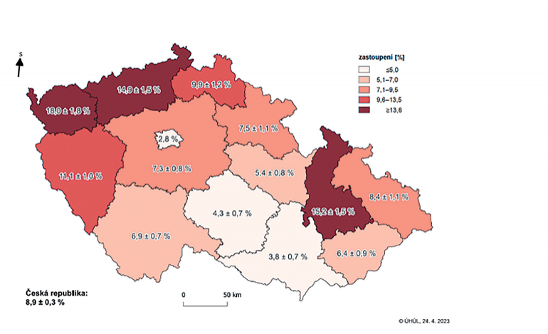 Z našeho šetření, konkrétně ze třetího cyklu Národní inventarizace lesů 2016–2020 (NIL), vyplývá, že poškození není rozhodně zanedbatelné. Celkem 8,9 ± 0,3 % všech našich lesů je poškozeno zvěří. Situace se značně liší mezi jednotlivými kraji (kartogram 1).