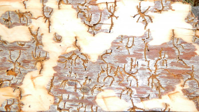 Rozvíjející se požerky lýkožrouta lesklého na kůře odloupnuté z douglaskového lapáku, foto: J. Lubojacký