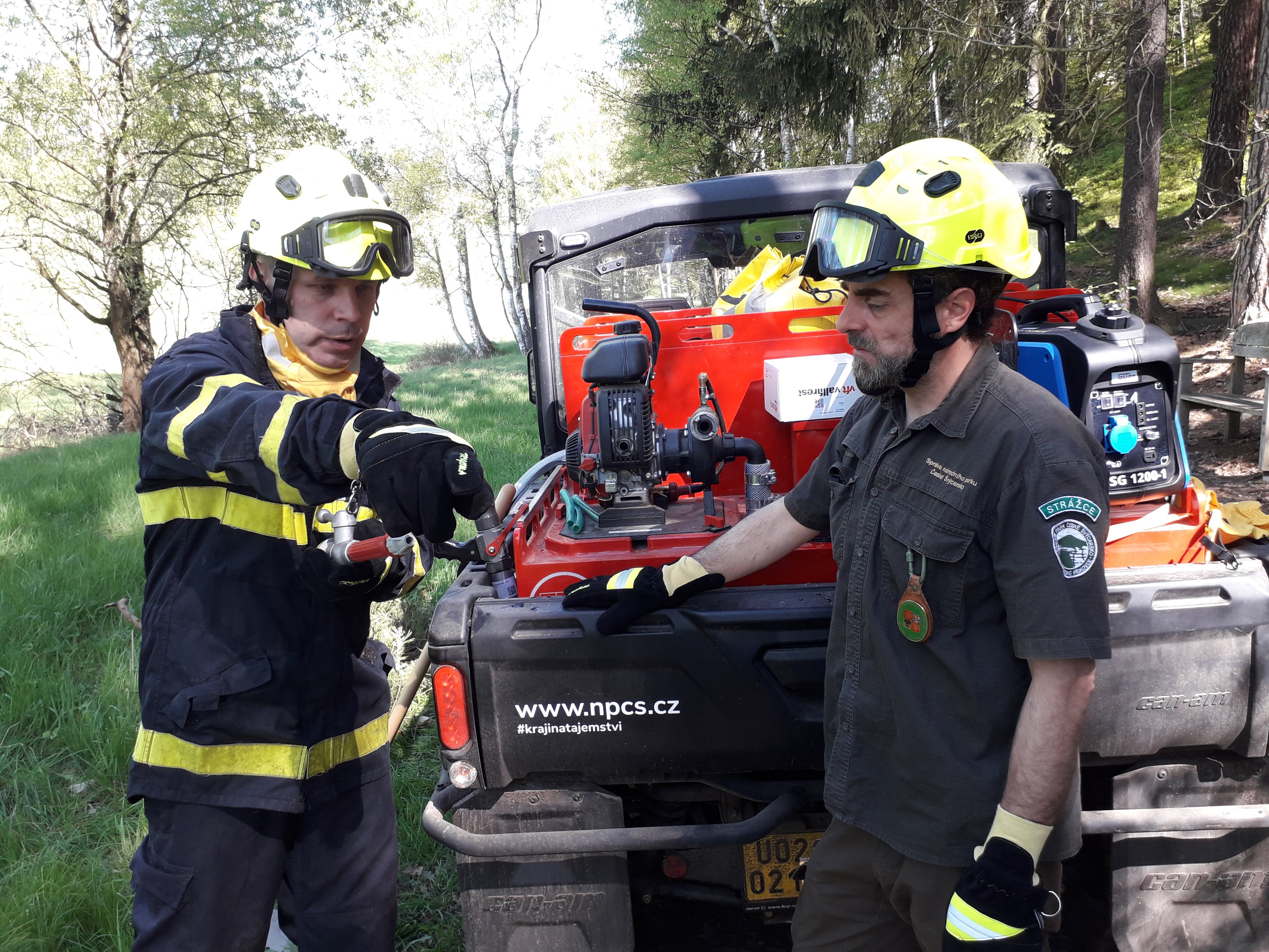 Školení stráže přírody Správy NP České Švýcarsko v zacházení s nově pořízenou hasičskou technikou provádí požární preventista (vlevo), jehož pracovní pozice byla po požáru zřízena. Foto: Tomáš Salov