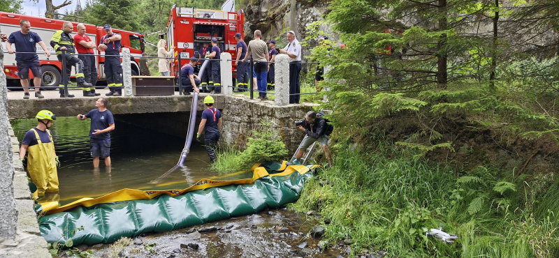 Jedním z řešení, jak zlepšit dostupnost vody pro případné hasební zásahy, je mobilní vzdouvací přepážka vyvinutá ve spolupráci s Hasičským záchranným sborem. V NP České Švýcarsko byla otestována v červenci letošního roku. Foto: Tomáš Salov