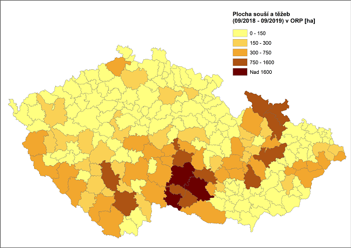 Na základě aktuální analýzy bylo období září 2018 až září 2019 v jehličnatých porostech detekováno přibližně 37 tis. ha těžeb a přibližně 8 tis. ha souší k září 2019. Vzhledem k výraznému zhoršení situace i v borových porostech byla na rozdíl od předchozích aktualizací provedena analýza nejen se zaměřením na smrkové porosty, ale i pro všechny ostatní jehličnaté porosty, které jsou nyní zobrazeny v mapových výstupech.