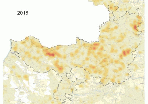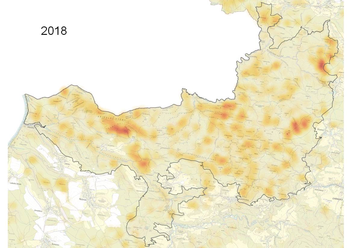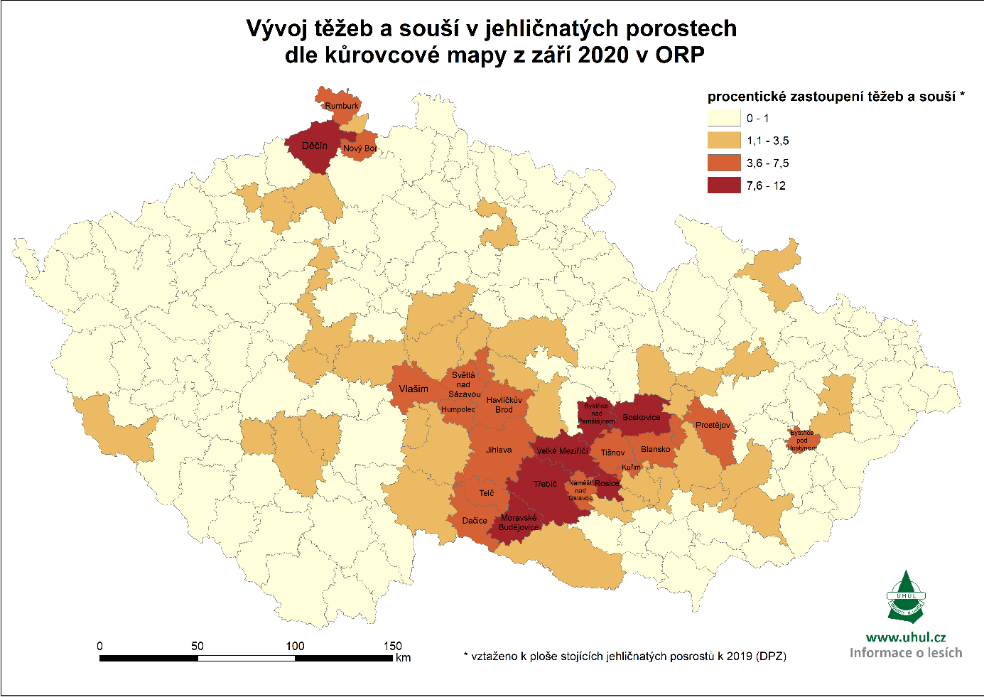 Dle celkové výměry těžeb a souší v převážně jehličnatých porostech jsou za aktuálně sledované období nejvíce zasaženými ORP především Děčín (cca 1 550 ha) a Jihlava (cca 1 550 ha), dále pak Boskovice, Třebíč, Velké Meziříčí, Bystřice nad Pernštejnem, Pelhřimov, Havlíčkův Brod a další. Proti předchozímu období nastala tedy změna a nejvíce zasaženým ORP (dle součtu detekovaných těžeb a souší) se stal spolu s ORP Jihlava i ORP Děčín. Pro dané území ORP Děčín má dominantní vliv vývoj situace NP České Švýcarsko, kde lze na ukázkové animaci vizualizovat vývoj v čase od září 2018 do září 2020. (viz obr. 1 - animace).