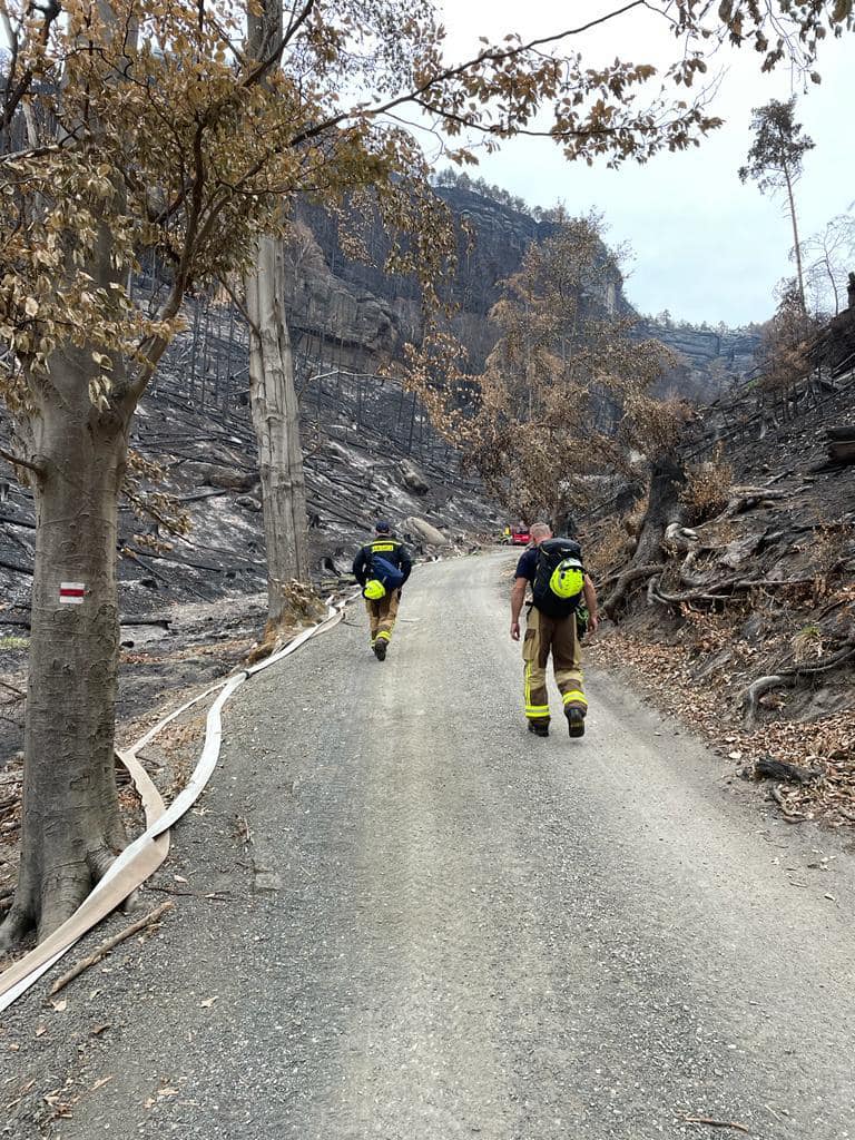 Obyvatelé Hřenska a jeho částí Mezná a Mezní Louka se od sobotního rána mohou do evakuovaných obcí vracet, nutná je ale povolenka. Silnice mezi Hřenskem a Mezní Loukou, kterou by za běžných podmínek lidé k návratu využili, ale zůstává zavřená. Stromy tam nejsou v dobrém stavu a vozovka je poškozená těžkou technikou hasičů.