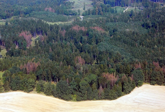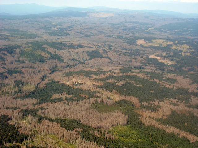 Titulní foto: Celkový pohled na území Boubínského pralesa, s patrnými ohnisky smrkových kůrovcových souší (Šumava, konec srpna 2012).