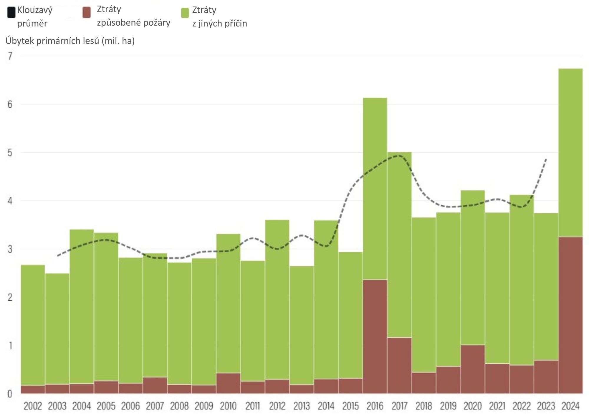 Ztráta lesního porostu v roce 2024 vzrostla na rekordní úroveň, jak uvádí nejnovější data z GLAD Lab při Univerzitě v Marylandu, zveřejněná prostřednictvím iniciativy Global Forest Watch, platformy poskytující aktuální data a nástroje pro sledování stavu světových lesů, jež provozuje mezinárodní nezisková organizace World Resources Institute (WRI). Nejvíce zasáhla tropické primární lesy, jejichž úbytek dosáhl 6,7 mil. ha – téměř dvojnásobek oproti roku 2023. To odpovídá ploše velikosti Panamy, nebo také rychlosti 18 fotbalových hřišť mizících každou minutu.