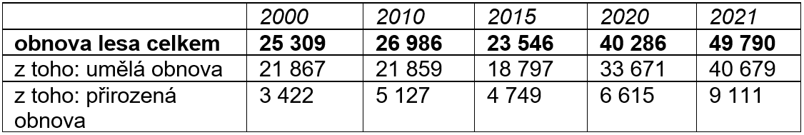 Oproti předchozím rokům výrazně vzrostla plocha obnovených lesních porostů, a to na 49 790 hektarů, což je oproti předchozímu roku o 9 504 hektarů více. Výše přirozené obnovy je 9 111 hektarů, ve srovnání s rokem 2000 jde téměř o trojnásobný nárůst.