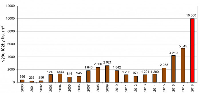 Vývoj objemu vytěženého smrkového kůrovcového dříví od roku 2000 s odhadem pro rok 2018. Zdroj: VÚLHM