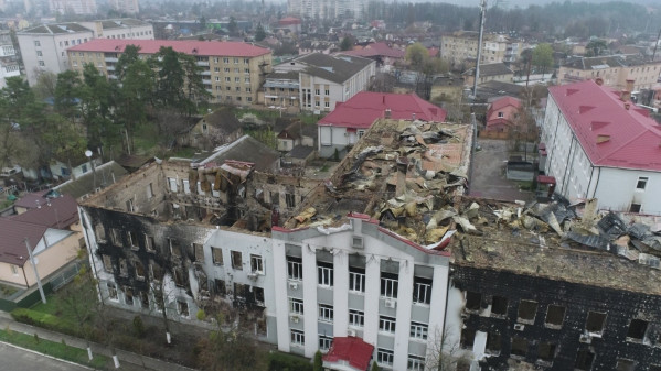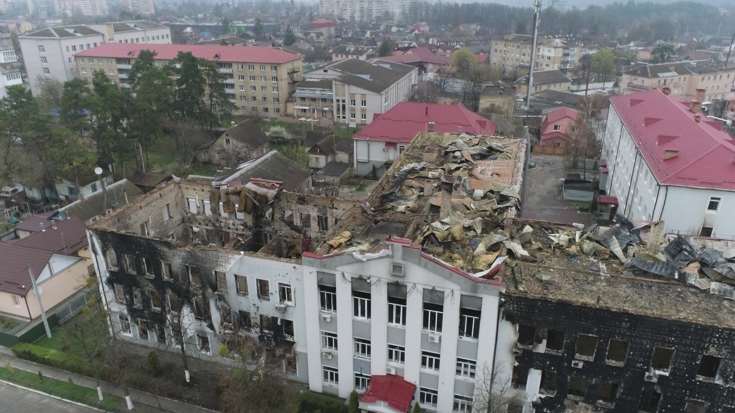 Vybombardovaná budova Ústavu státního lesního hospodářského plánování v Irpini.