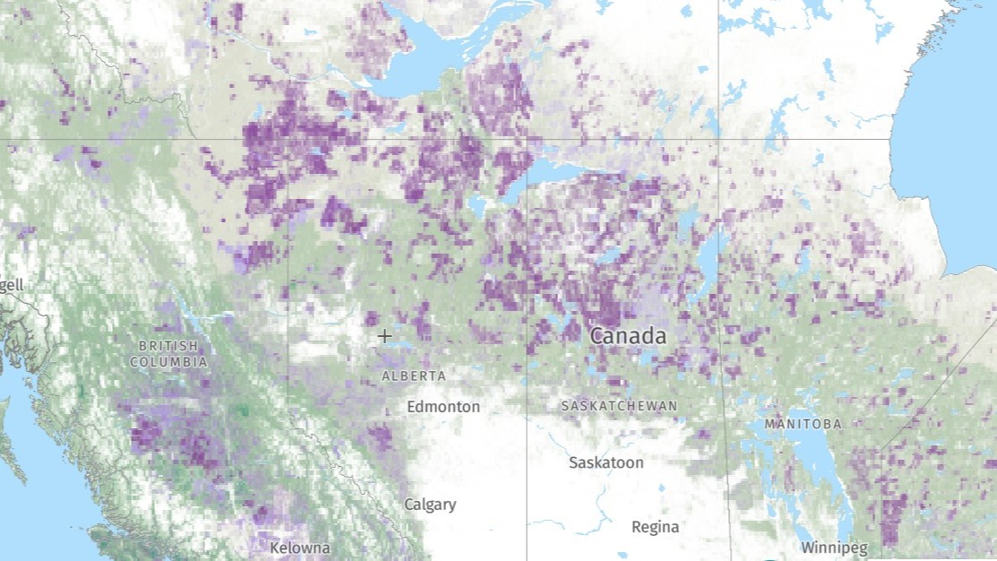 Emise skleníkových plynů z lesů (fialová) a pohlcování uhlíku lesy (zelená) v letech 2001-2024 v Kanadě při zobrazení nejméně 30% hustoty zápoje. Zdroj: globalforestwatch.org