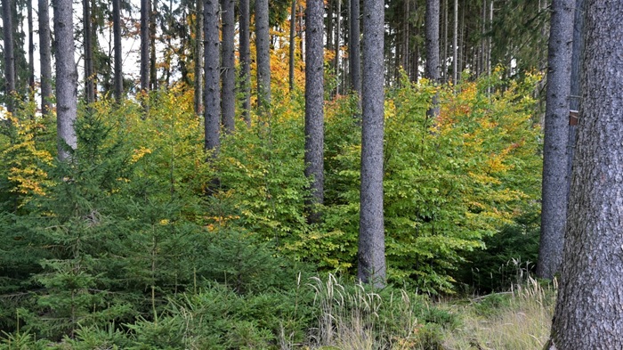 Buk rostoucí pod smrkem vytváří základ pro nestejnověký, vícevrstvý porost.