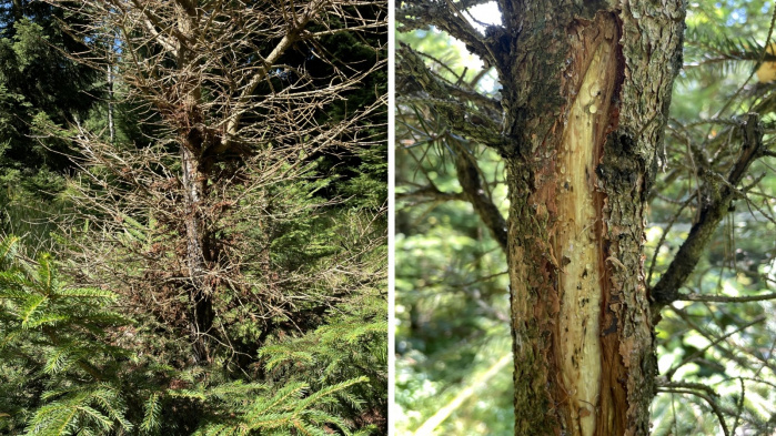 Silné poškození mladého smrku ošetřené proti hnilobě, Krušné hory. Foto: Jan Řezáč
